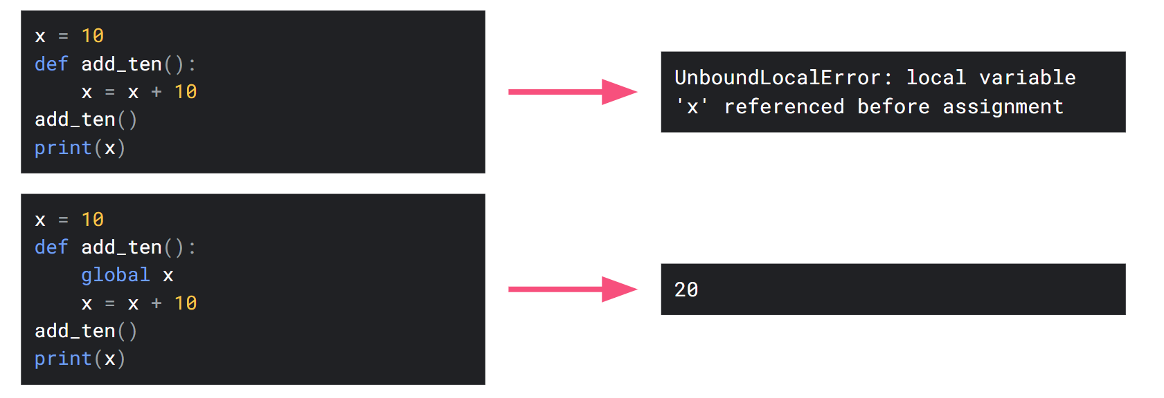 We can use the global keyword. By placing global before any global variable name inside a function, it will be assigned its value and any modifications will **not **be local.