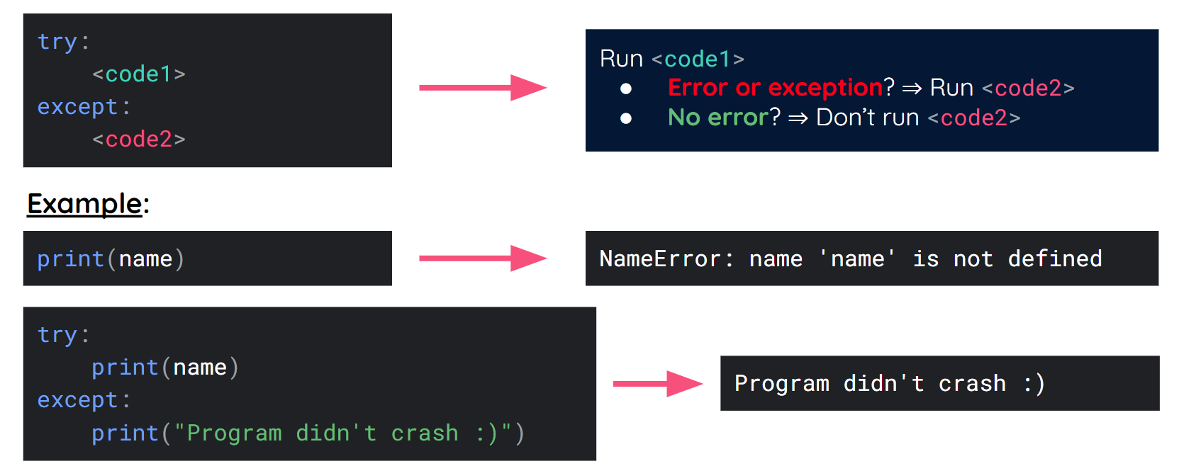 Usually, errors in our code would stop the execution of our program. However, if we want to catch and handle these errors, we can use the try and except block.