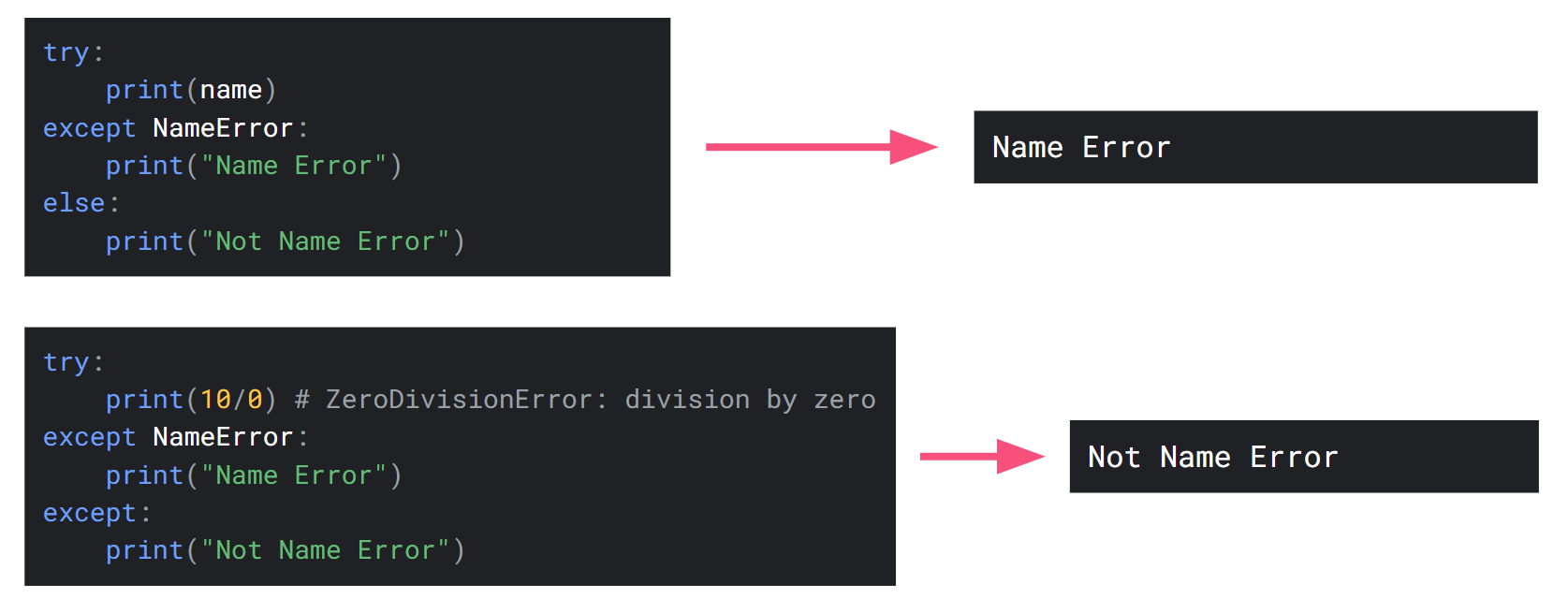 We can also specify a specific error to catch using except. Consequently, like if/else statements, we can stack except statements: