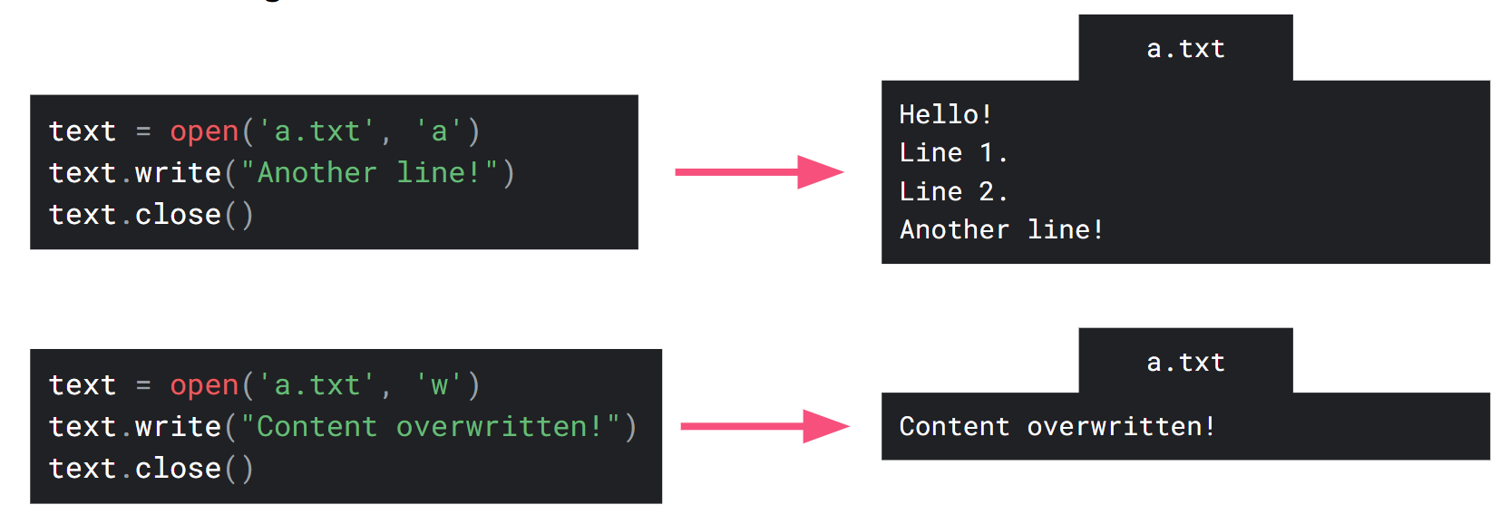 If we wanted to add more text to the end of a.txt, we would use the following code: