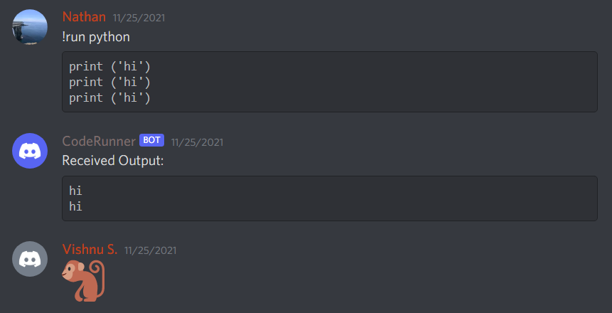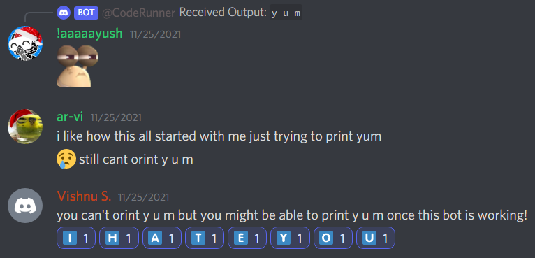 It has the core functionality outlined in the previous meeting of security, performance, and language support using the code execution engine Piston. You can use the bot right now in our Discord server! Head over to the #bot-spam channel to use the bot.